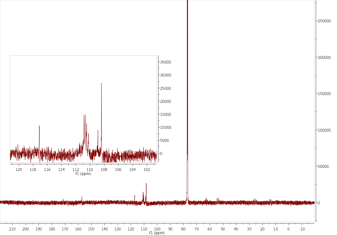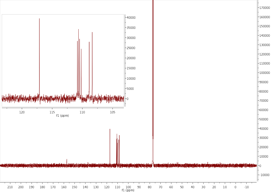 when set the O2P to -122 ppm, the decouple working for this group carbon with fluorine. But there only 6 carbon, and 108.36 peaks are doublet peak, maybe this peak is splite by the CF3 (-80 ppm), whick not cover by this decouple pulse.