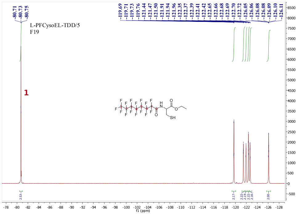 from this 19F spectrum, we known there are two group peaks in -80 ppm and -120~-128 ppm.