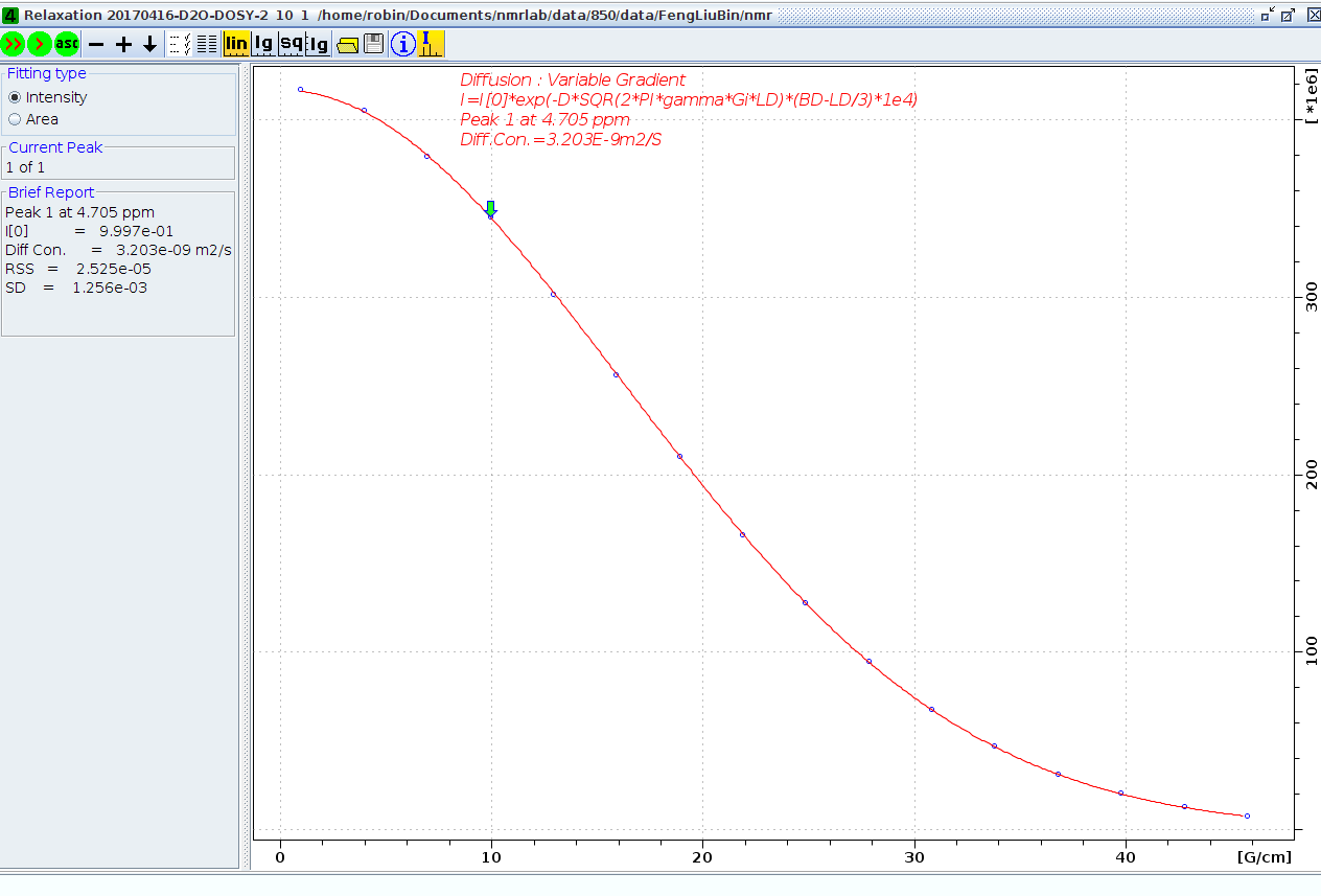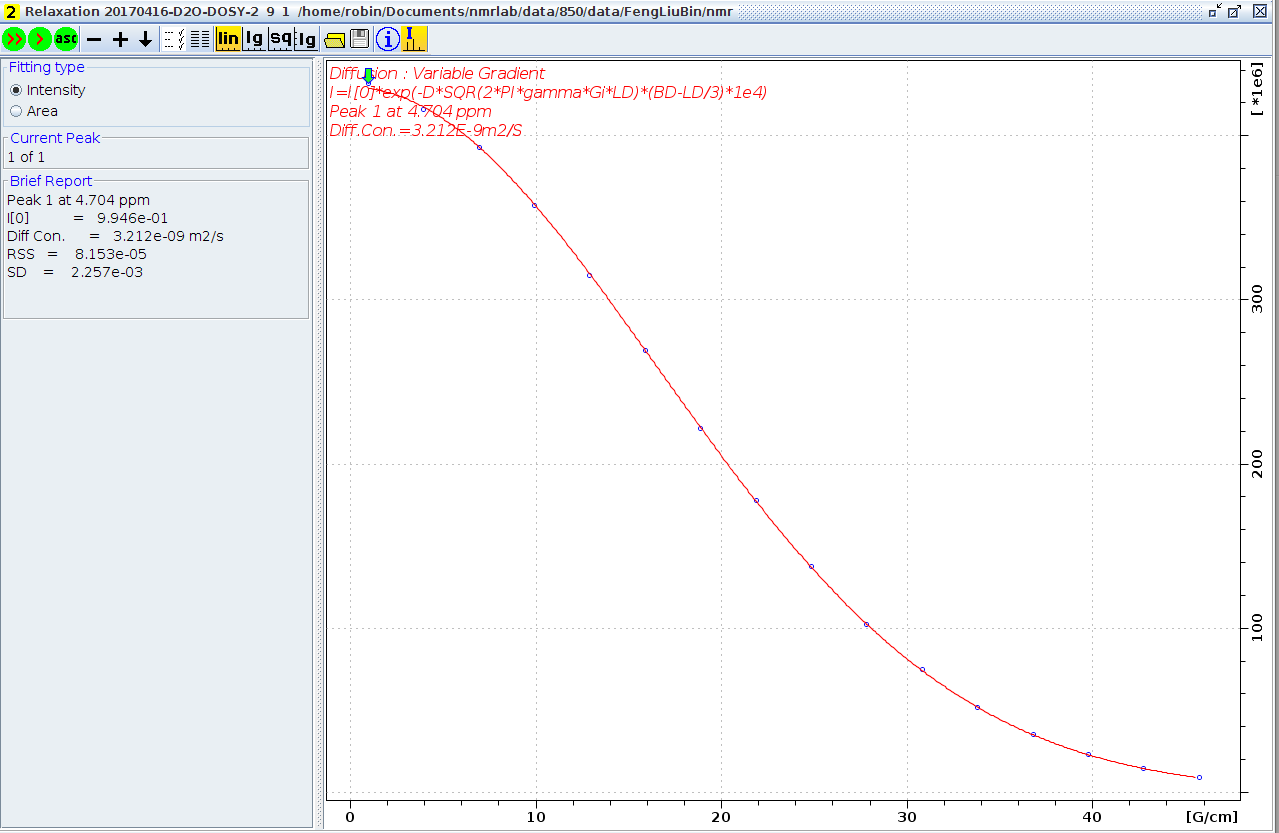 The "ledbpgp" and "dstebpgp" expriments are carried out, and get the same result 3.2 X 10-9m2s-1, and now the system set the gradient strength 53.5 G/cm in "setdiffparm", from Gnew = sqrt(D/Dliter) X Gold equation given the system gradient strength 69.3 G/cm. This value is not far off the strength 59.78 G/cm from the profile expriment. As described above, this value is more accurate.