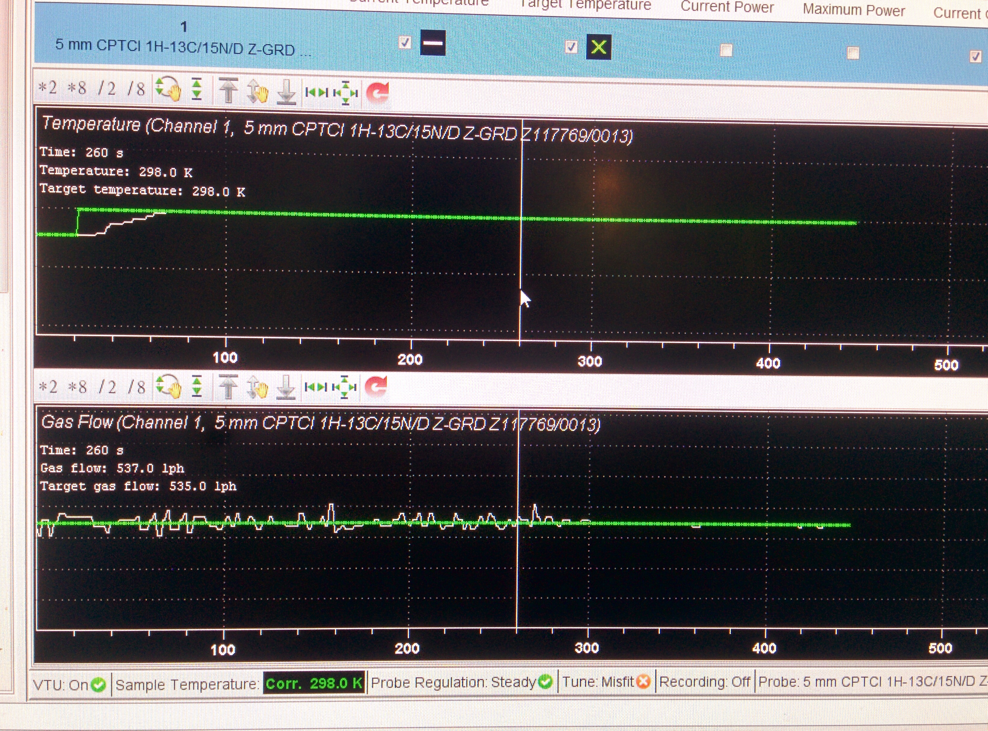 Methods: the expriment is on 850MHz Bruker Avance III system with CPTXI probe. The sample temperature is corrected by MeOD sample, and set the temperature to 298K, wait the temperature and gas flow steady 20 minutes.