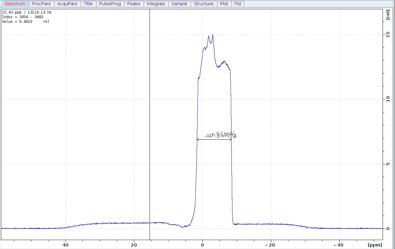Preform the "calibgp" in bruker using 10% and 20% gradient strength. Also the dip is not sharp, and you can not get accurate how wide of the dip in gradient profile specturm. In 1mm tube there is tilted phantom, the image profile has fuzzy boundary. and the 3mm unkown plastic has nmr signal diffrent with water, so there is one platform in image profile spectrum. This method about the measurement of a 1D image profile is detailly discipted in Timothy D.W. Claridge's Book, using the width 8600Hz and 0.33cm height of the phantom, the maximum gradient strength for 850MHz/AvanceIII/CPTXI system is 59.78 G/cm. Because the unkown plastic is out of shape after insert to nmr tube, and the width of dip is not precise, this strength is approximate value.