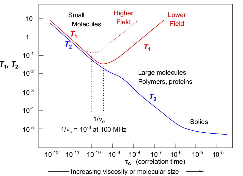 弛豫是由于瞬态磁场(通常是由于分子运动产生)在拉莫进动频率下发生的。在分子转向速率(reorientation)和拉莫进动频率差不多情况下,