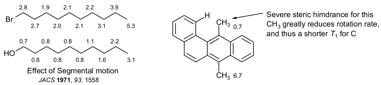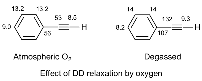 受氧气影响弛豫。氧气的未配对电子通过耦极相互作用引起氢和碳原子的弛豫。此效应虽然不大,但是很容易从phenylacetylene(苯乙炔)中的季碳中观察到,比如出去溶液中的氧气,ipso碳的