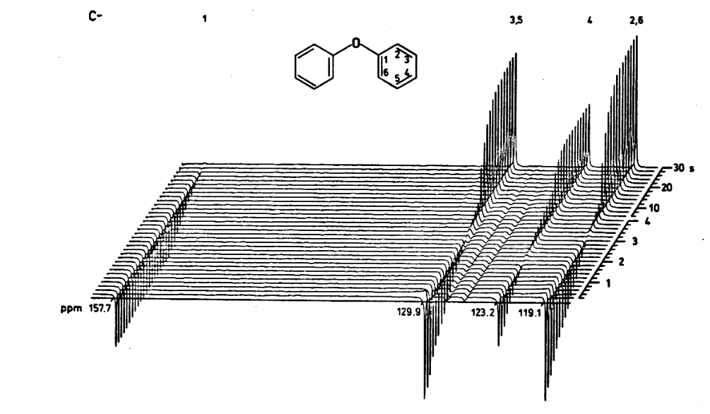 也不同),所以在长轴上面的碳原子的弛豫时间将会和没有在轴上的原子有加大的不同。diphenyldiacetylene(二苯二乙酰)就是一个不错的例子。对位的碳原子的弛豫时间很短(1.1 s),而临位和间位的碳原子
