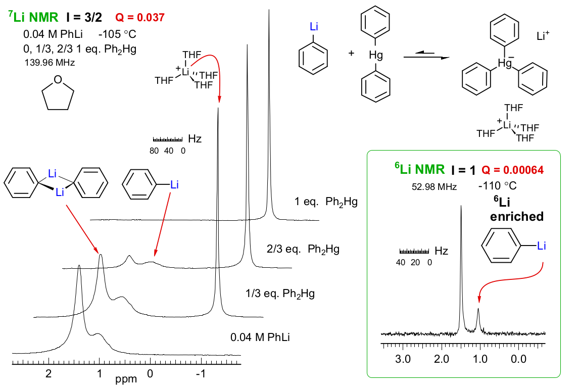 底下7Li和6Li核磁谱图解释了四级矩常数Q和对称性环境的作用。汞盐化合物中的锂离子被THF四面体溶剂化,显示出比较锐利的7Li谱峰(宽度4 Hz),但是PhLi二聚体谱峰就更宽(25 Hz),而单体由于比二聚体更加不对称,表现更宽(60 Hz)。由于6Li的Q比7Li小很多,对于单体(3.5 Hz)和二聚体(2.2 Hz)的谱峰就锐利很多。在6Li谱图中有一小部分谱峰展宽是由于单体和二聚体之间的动力学交换导致的,这个是单体谱宽比二聚体比较宽的原因(Reich,Green, Medina, Goldenberg, Gudmundsson, Dykstra, Phillips, J. Am. Chem. Soc. B, 120, 7201 (Reich, Green,Medina, Goldenberg, Gudmundsson, Dykstra, Phillips, J. Am. Chem. Soc. 1998, 120, 7201; Reich, Green, Phillips,J. Am. Chem. Soc. 1991, 113, 1414)。用WINDNMR模拟计算的谱宽宽度。