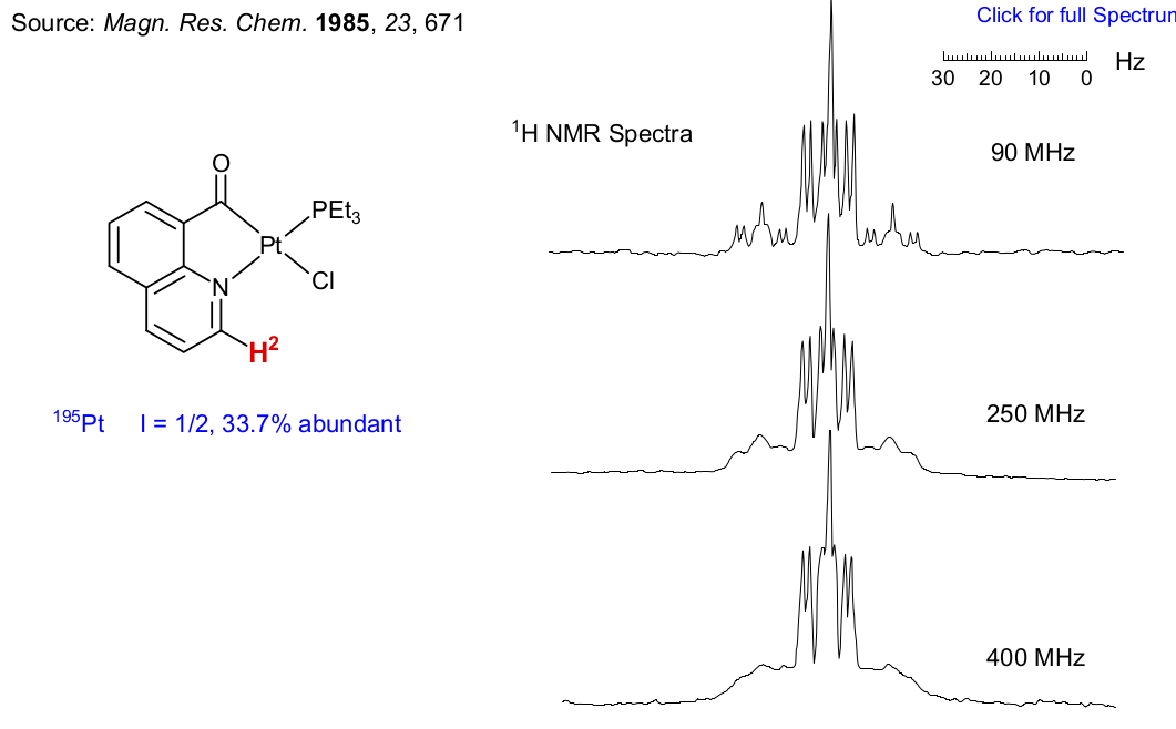 下面的1H谱图阐释了上面提到的最后一个特点。图中显示铂络合物中H2氢原子在90,250和400 MHz谱图。对于NMR不敏感的Pt原子化合物中所有的原子谱图峰模式为中心ddd裂分模式。两边比较弱小的峰为自旋1/2的