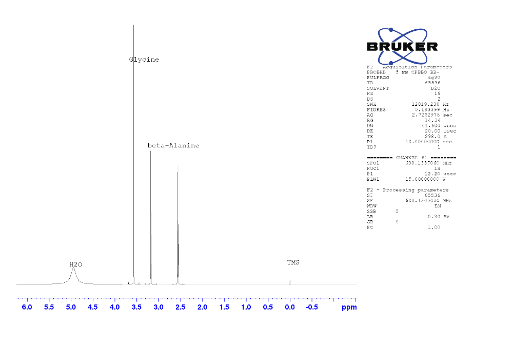 59.21mg of Glycine ( Sangon Biotech, 99%) and 53.49mg of β-Alanine ( Sangon Biotech 98.5%) were accurately weighed by a Sartorius analytical balances with a readability 0.01 mg, and transferred into an 5mm NMR tube (Schott NMR sample tubes), with adding D2O solvent( 99.9% purity with TMS).