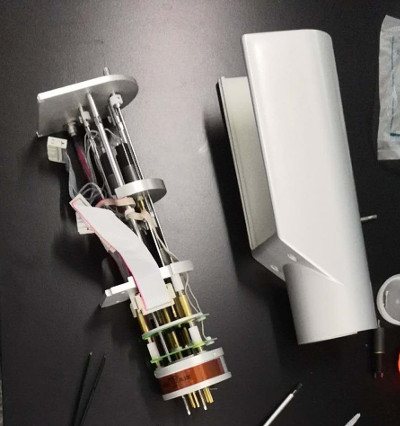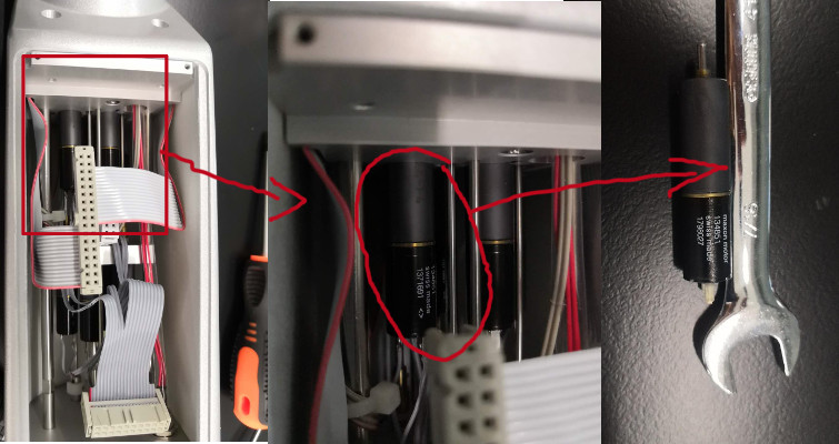拆下探头底部的ATM部件(在拆之前请先在cryopenel里面把bottom temp关闭), 用手动调谐杆调8个调谐通道,发现所有的通道是可以无阻碍的调到底部和回来的。此处说明探头的调谐杆没有问题,问题不是出在探头的调谐杆里面。此时如果不用自动ATM部件,可以用手动调谐做实验。此时我们按压ATM部件7Tune通道,发现那个金铜色的杆子按压有一定的阻力。尝试按压几次,然后装回探头,曾经有一次ATMA可以通过,但是在调谐15N的时候Tune还是有问题,很快就到底部了。所以怀疑可能7<15N Tune>的调谐马达可能有问题。