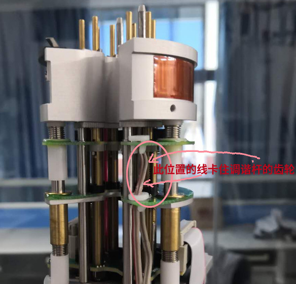 由于之前并不懂得如何拆这个ATM部件,很多都是摸索前进的。所以我并不清楚这个部件是如何工作的,也觉得有可能是里面有什么地方卡住导致调谐问题。在尝试多次以后,终于了解并成功拆开ATM部件的,发现在7<15N Tune>这个调谐杆附件有一个电线会蹭到调谐杆的一个指示凹起,目前那个电线表皮已经有一部分被蹭破。所以我怀疑这这个电线导致7通道调谐卡住。底下有配图。目前我把这个电线拉远离这个调谐杆,重新装回去探头,ATMA可以顺利通过。同时手动ATMM调谐15N通道也可以漂亮完成,所以我认为就是这个原因导致的。