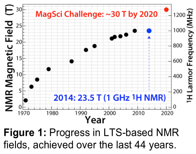 虽然LTS磁体在12T以下非常高效,但是在高于15T,每增加5-10%的磁场强度成本就要翻一番。即使我们努力一把使得LTS磁体达到需要的强度,稳定性和均匀性,这样子的磁体体积会非常大,而且也非常昂贵,场地大小也只能极限于非常少的实验室。成本问题阻碍了磁共振基础科学的发展,而在美国磁共振中尤为严重。目前(编者按:2015年)全球磁场强度在22.3-23.5T的NMR有14台,其中欧洲有7台,亚洲和澳洲有4台,和美国有2台。另外两台23.5T核磁在欧洲(拜罗伊特,德国)和北美(多伦多,加拿大)安装。欧洲多个研究机构预定了7台以上的25.8-28.2T的NMR仪器:一台25.9T(苏黎世,瑞士),和6台28.2T的(佛罗伦萨,意大利;哥廷根,德国;乌得勒支,荷兰;慕尼黑,德国;里尔,法国;尤利希,德国)。欧洲的机构还有其他三个订单(两个23.5T和一个28.2T的)。同样的,这些限制也制约着商业的人体MRIs的发展,目前在临床和研究应用也只能够买到7T的核磁共振成像。当前人体最高磁场MRI(9.4T)坐落在芝加哥大学和明尼苏达大学(9.4T和10.5T),还有NIH和萨克莱(法国)计划11.7T系统,南韩也提出14T的系统计划。虽然科学进展紧密依赖于更高的磁场,但是持续性的发展更大和更贵的高场磁体系统是不可能的。
