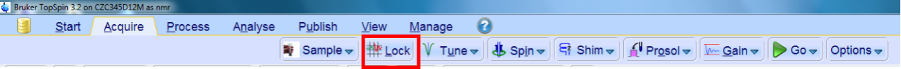 可以通过上面的“Acquire”- >“lock”,也可以直接在命令行输入 lock ,会弹出氘代试剂窗口如下,选择你使用的氘代试剂,然后点击“OK”,等待它锁场完成。