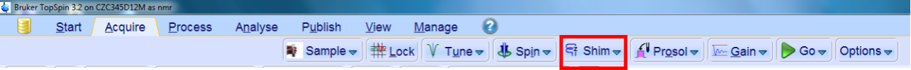 6. topshim,匀场。通过调节匀场线圈电流来是得检测区域的磁场强度上下左右均匀一致。匀场的好处直接关系到谱图质量,匀场不好,会导致谱峰不对称,分辨率不好甚至分裂。