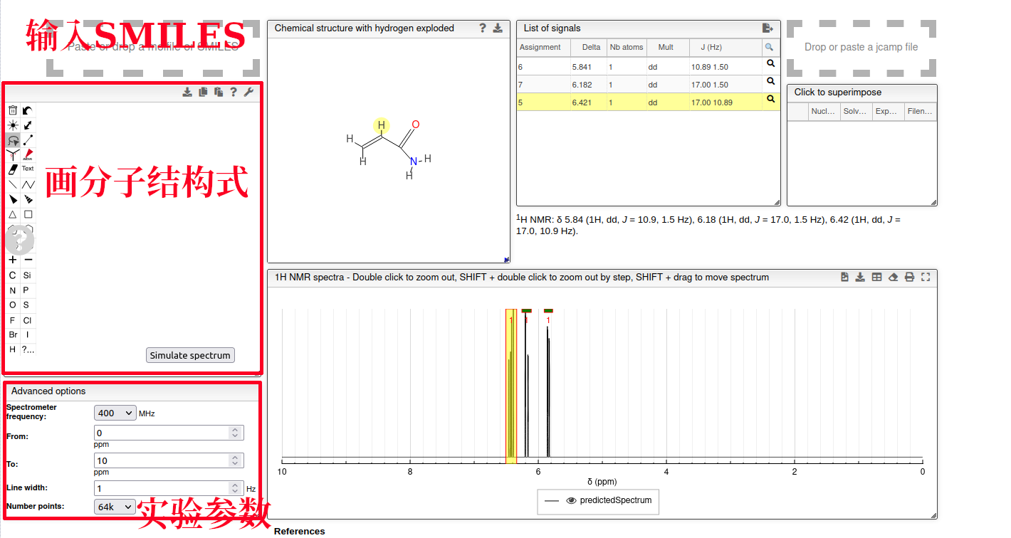 如果需要预测氢谱,点击“PREDICT 1H NMR”,然后输入分子结构式,修改相应的实验参数,点击模拟就可以得出氢谱谱图来,同时也包括耦合常数信息。