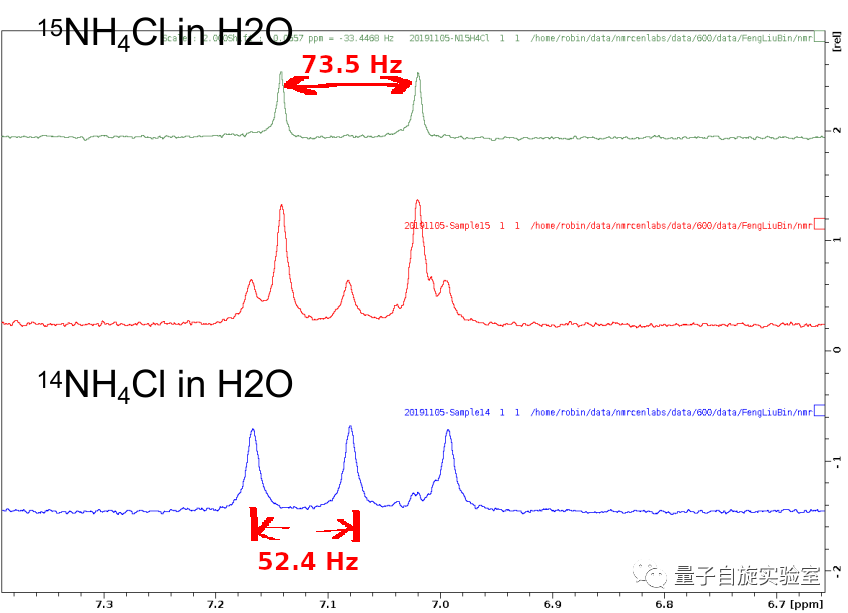 虽然14N的四级炬比较大,但是对于铵根离子这种对称性很高的分子,14N的T1弛豫在0.2s左右,所以可以看到对周围氢的耦合裂分。由于铵根离子还是活泼氢,只有在强酸条件下,可以看到它的氢谱,并且可以看到它被14N裂分为三重峰的情况。而如果用15N标记的话,就是两重峰。由于14N和15N的同位素效应,他们的化学位移稍微有点偏移。