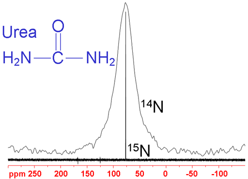 14N 的天然丰度为 99.63%, 自旋为1,四极矩为2.044fm2(相对比较大),共振频率36.1 MHz/500MHz。